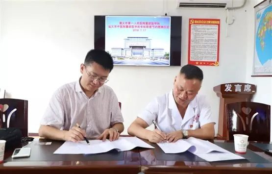我院重症医学科(ICU)建设取得新进展,2019年7月17日上午,我院重症医学科与遵义市第一人民医院重症医学科成立学科联盟并举行了签约仪式。遵义市第一人民医院综合重症医学科主任、主任医师温建立,科室质控主任、主任医师王远方,国际伤口造口师、护士长王国贤,重症医学科全国青年专家、副主任医师谢鹏,我院党委副书记、院长,副院长葛庆,医务部副主任、副主任医师田茂兵及重症医学科医护人员参加签约仪式,签约仪式由田茂兵主持。
