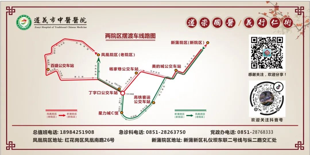 遵义市中医院春节应诊公告 急诊科电话:28263750 恭祝全市人民新年快乐! 身体健康! 凤凰院区 地址:红花岗区凤凰南路8号 新蒲院区 地址:新蒲新区东联二号线与合兴大道交叉口 温馨提示 1.放假期间,门诊按上表排班坐诊。