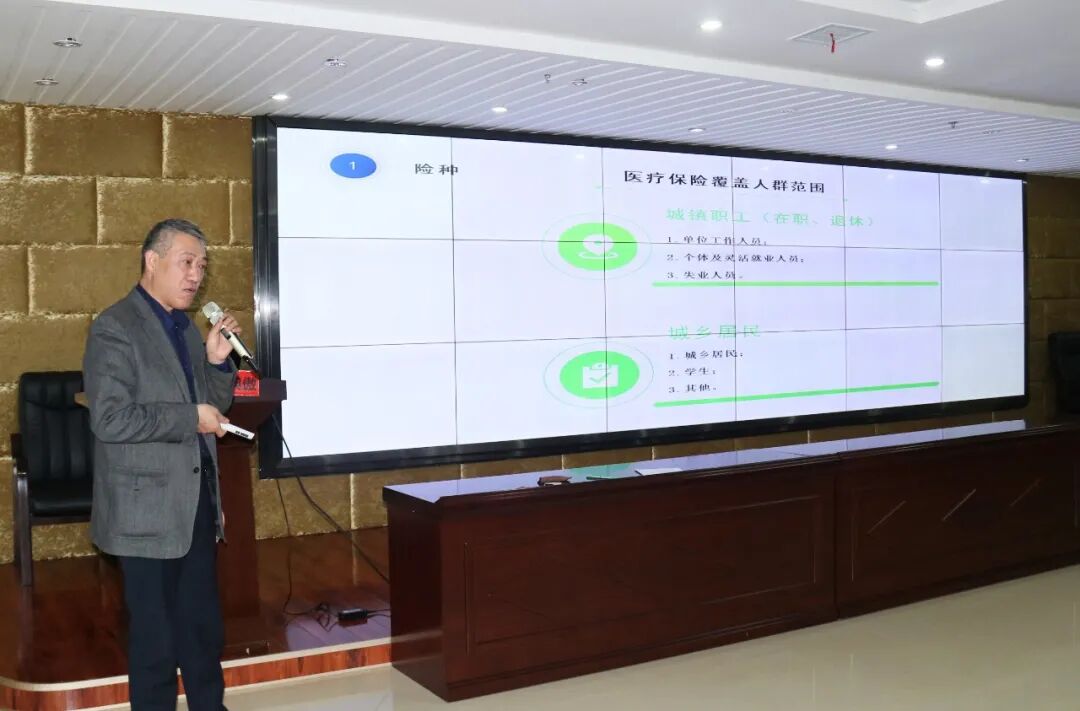 谢典傲分别从医疗保险险种、医疗保险筹资、医疗保险待遇及其他四个方面作《医疗保险政策培训会》讲座。