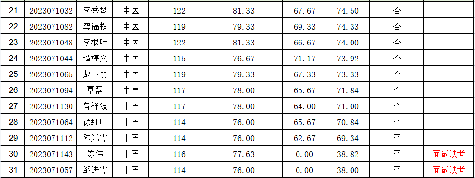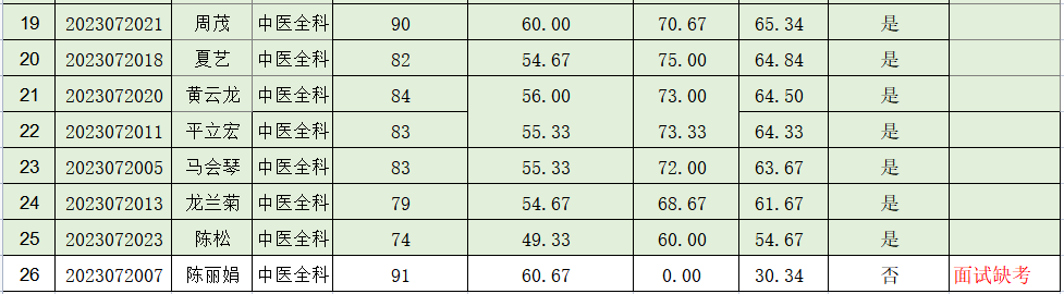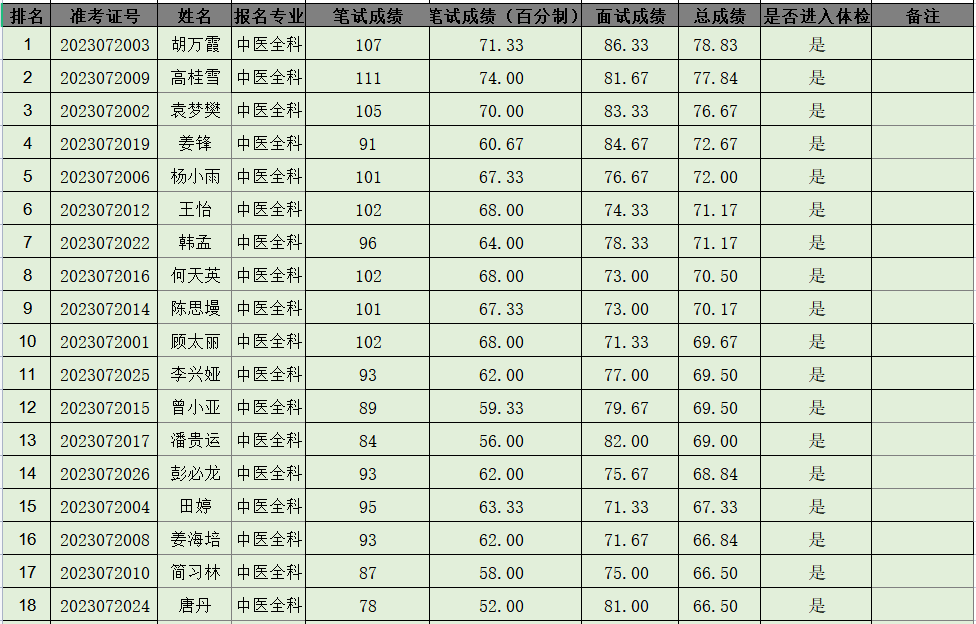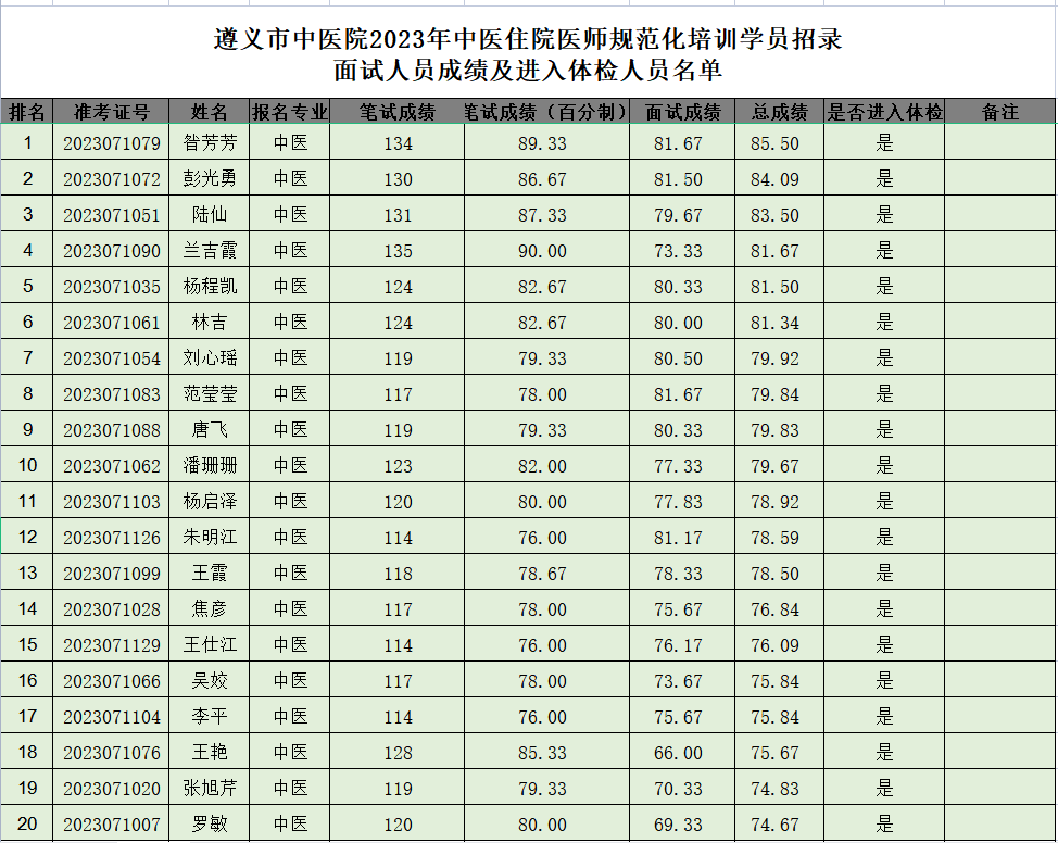 【通知】遵义市中医院2023年中医住院医师规范化培训学员招录面试人员成绩及进入体检人员名单公示