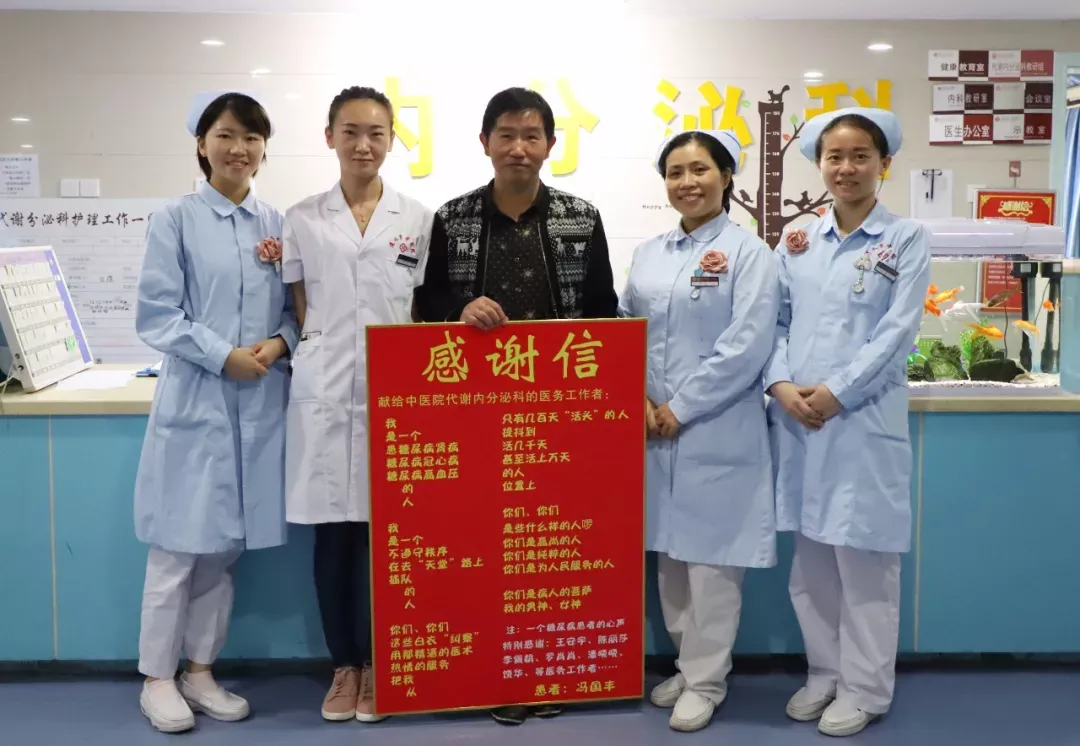 这是市中医院内分泌病科患者冯先生出院时献给他管床医生和全科医护人员的感谢信。“我真的很感谢他们,他们很热心、细心,也很耐心,让我很感动!科室里面氛围很好,很亲切,没有那种冰冷的感觉,像一家人。”