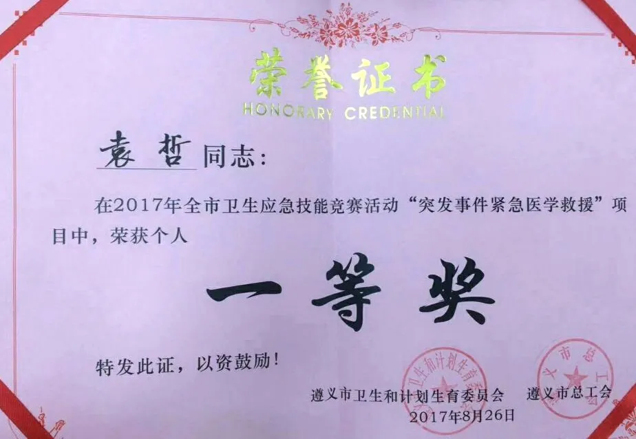 8月25日,2017年遵义市卫生应急技能竞赛展开比拼,来自遵义市各县(市)区、市直医院、贵州航天医院的参赛团队在比赛中各显身手,展示自己的卫生应急技能。来自市中医院肾病风湿病科的袁哲医生获得“突发事件紧急医学救援”项目个人一等奖。
